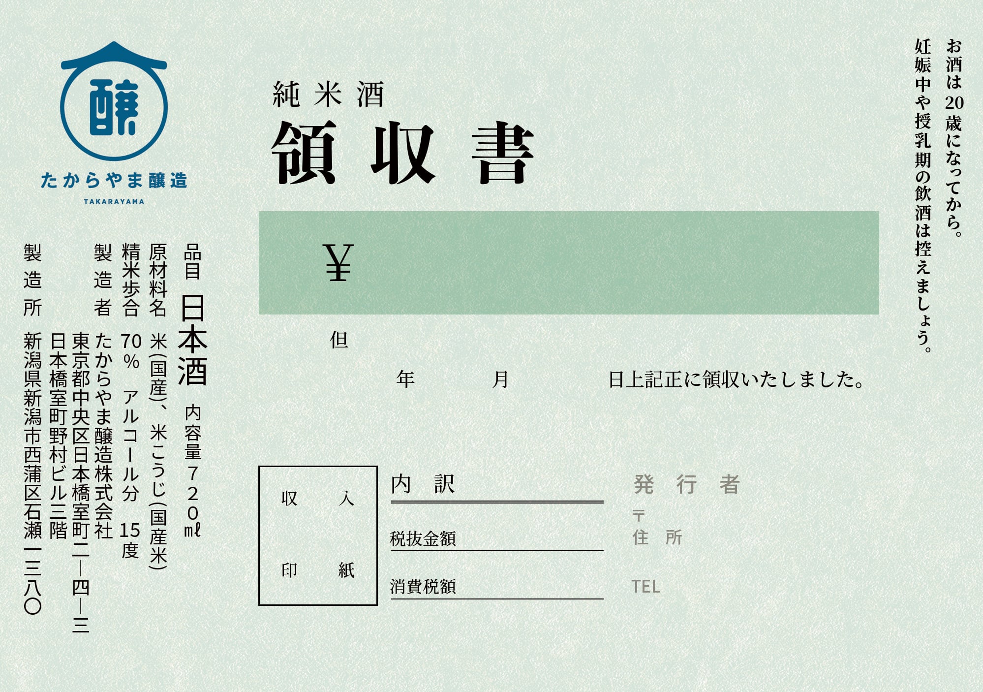 純米酒 領収書 + 領収書ラベルステッカー付き